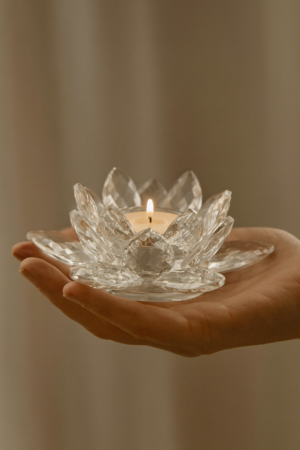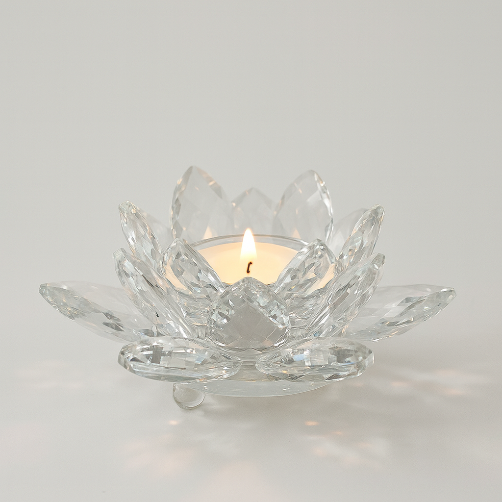 Lotosový svietnik z krištáľového skla pracuje ticho. Čajová sviečka sa v ňom láme do jemných vzorov, ktoré dopadajú na okolitú plochu a prirodzene stlmia miestnosť. Na nočnom stolíku, pri vani alebo v obývacom zákutí vytvára sústredený bod pokoja. Hluk dňa sa rozptýli v mäkkých odrazoch, rytmus sa zarovná.